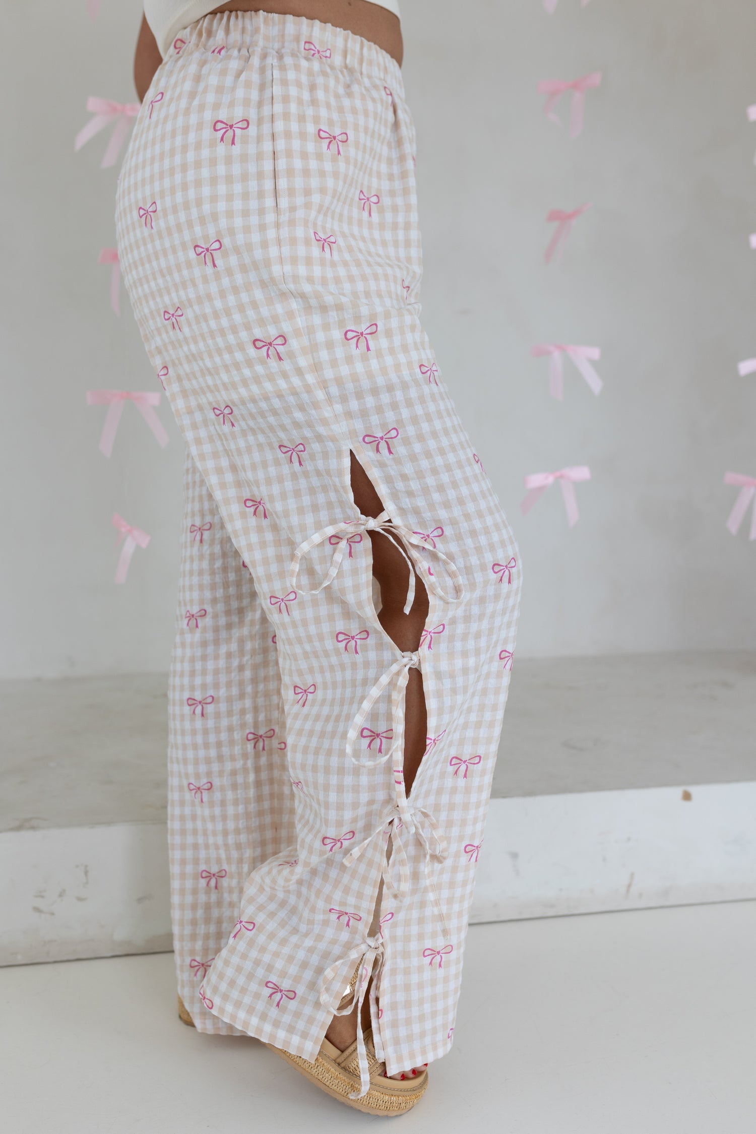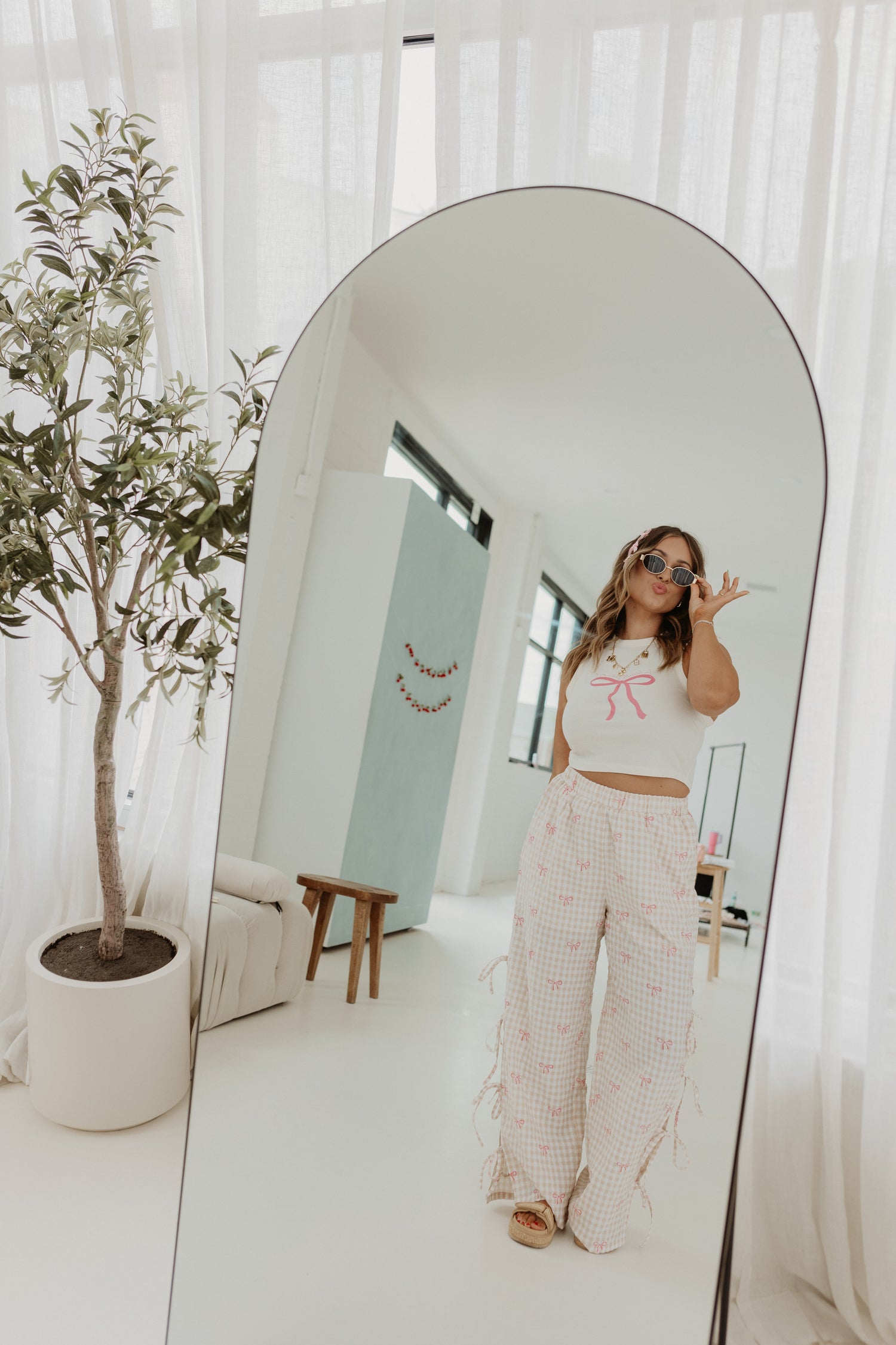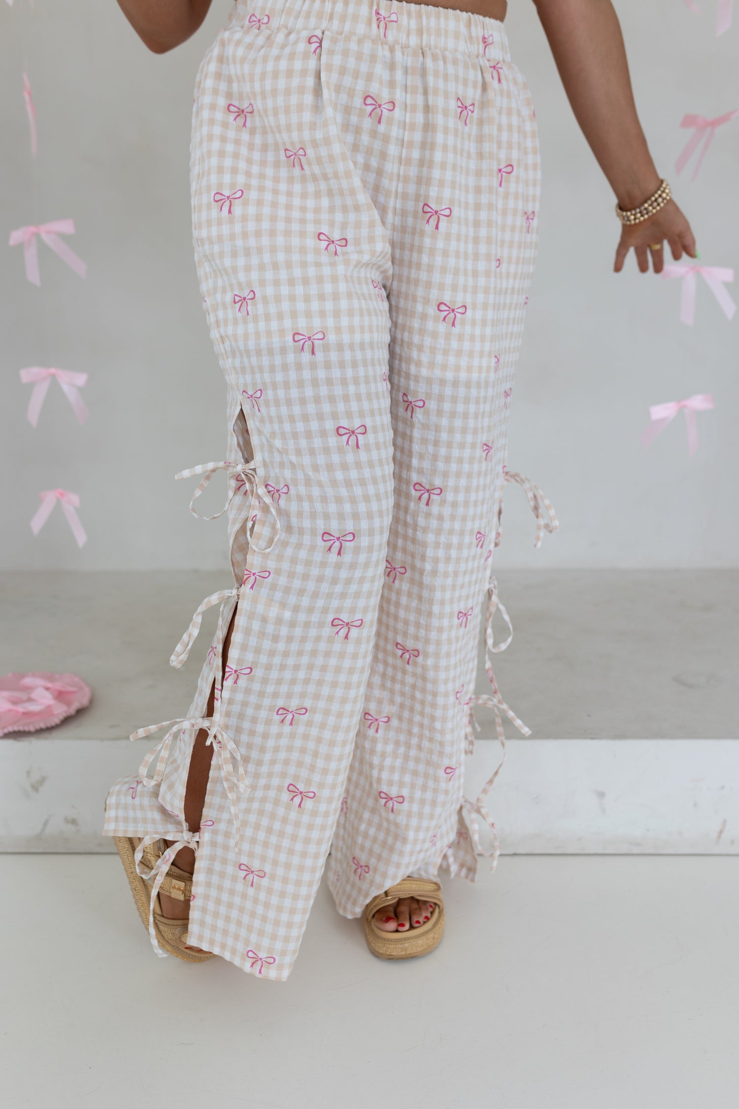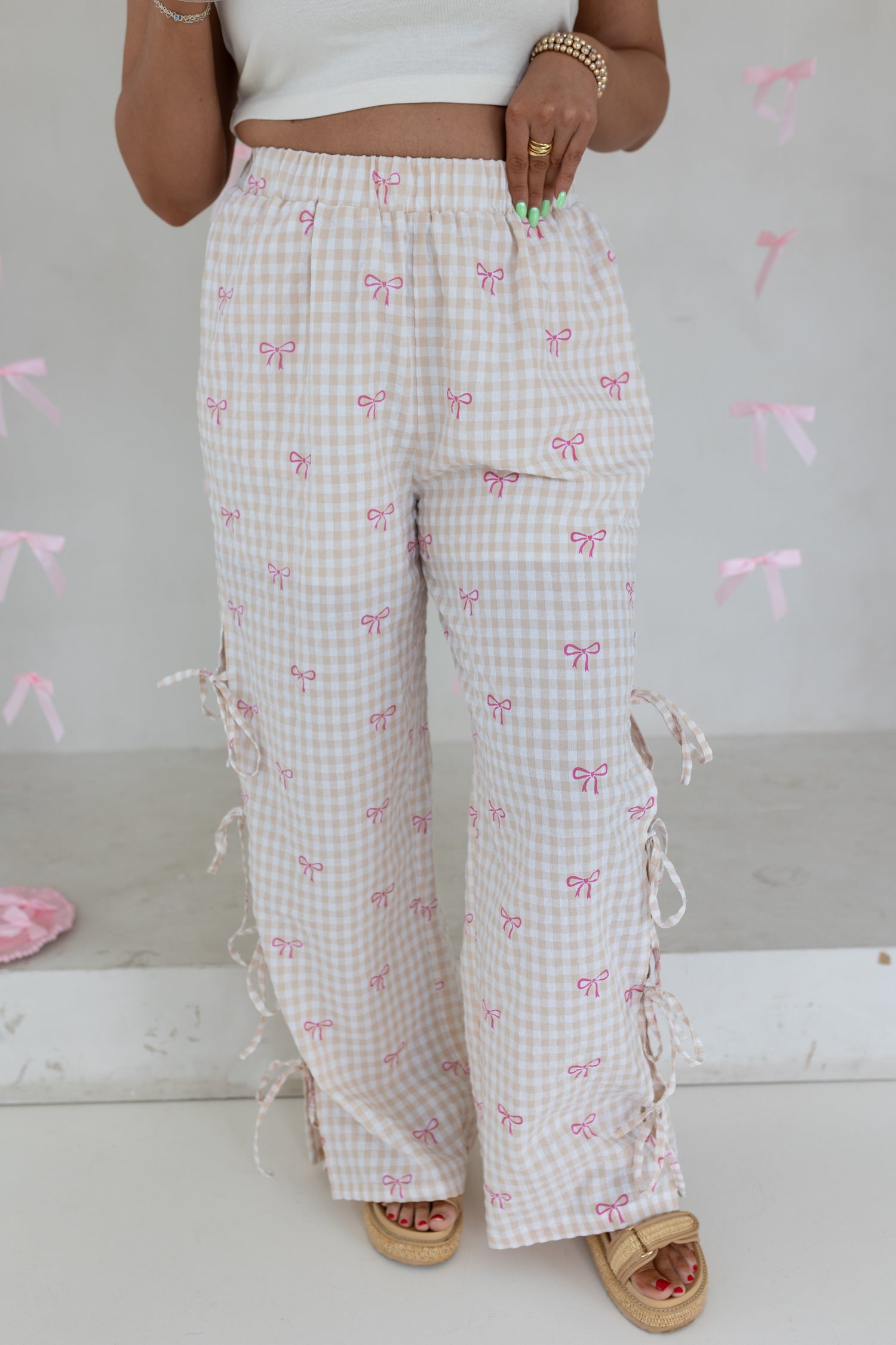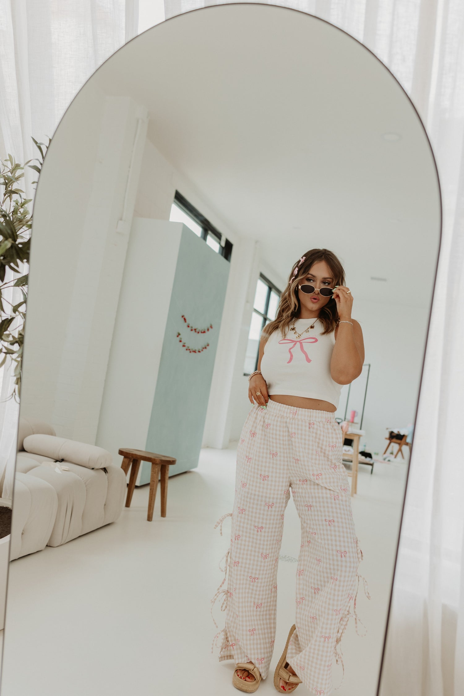Say hello to your new favorite pants!!! These pants are so fun and unique! These pants have a shorts lining inside, elastic waist band, tie detailing down the side, pockets, and custom printing all over! These were designed in house by your favorite girlies and we are all so obsessed with them! These pants fits true to size! Catlyn is wearing the M here in the photos! Please see size chart and reach out with any questions!