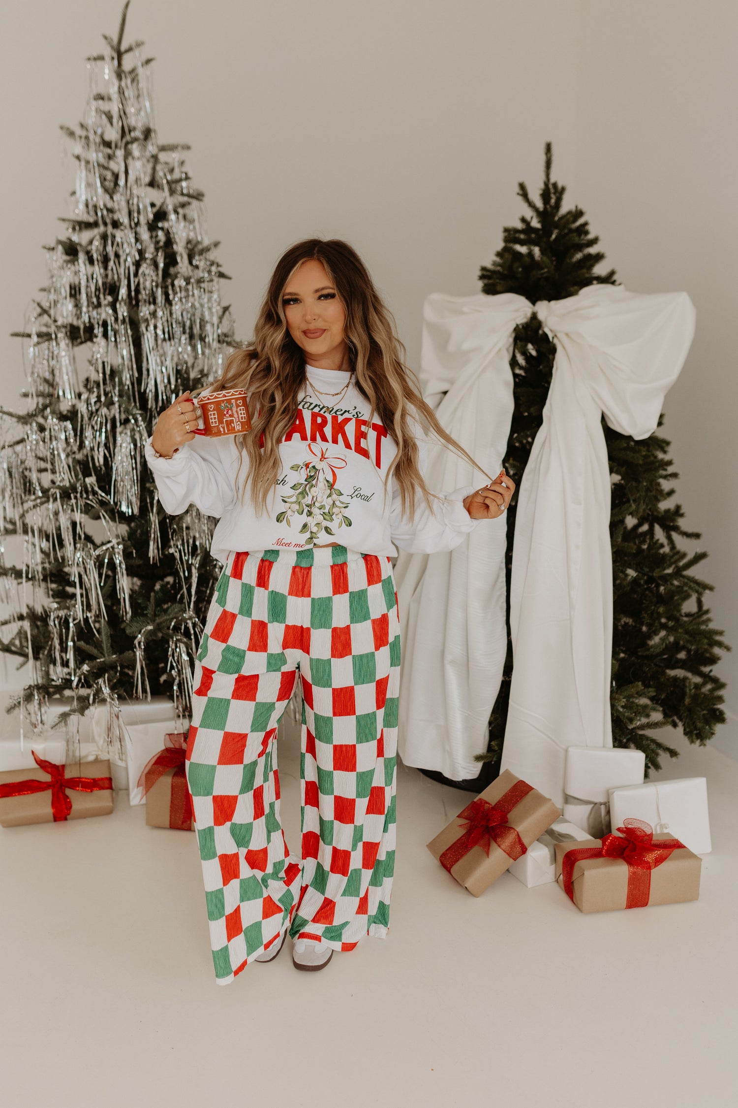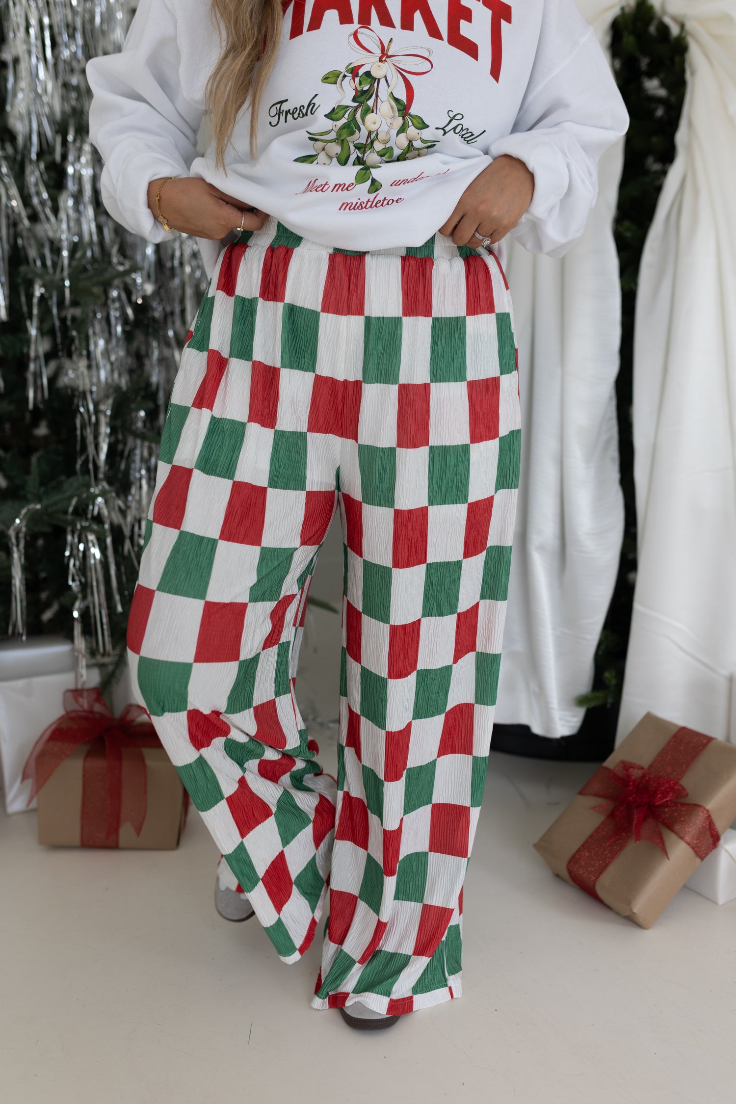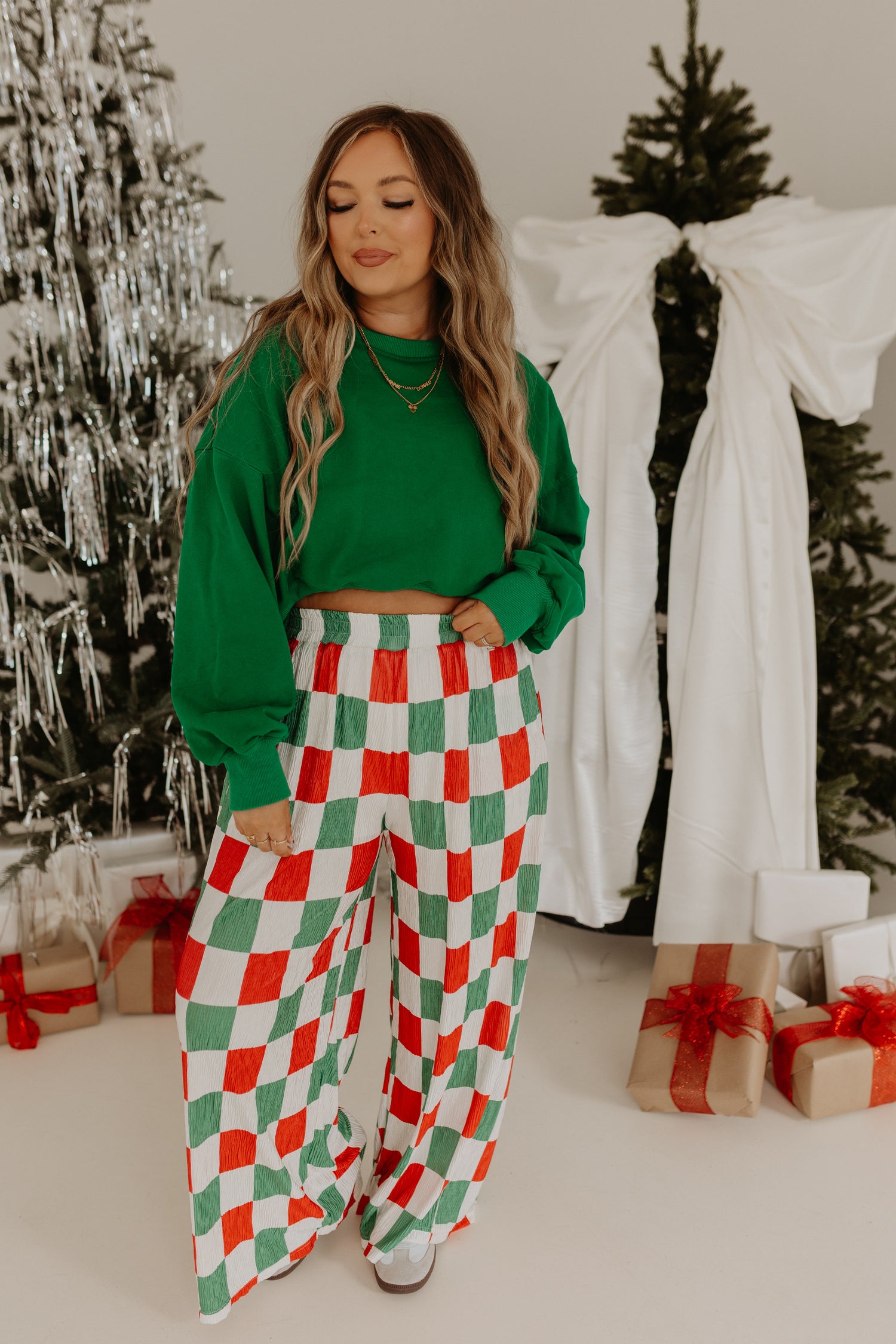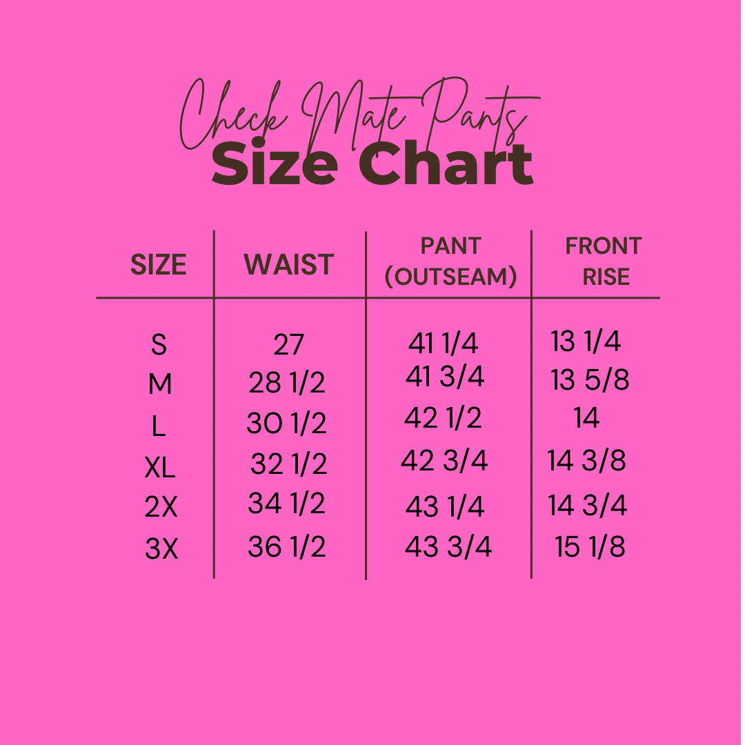 Our famous checkmate pants are back in a new color way! We LOVE these pants so much! They have an elastic waistband, pockets, and a lining so they aren’t see through. They are a light weight poly fabric! We recommend getting your true size! Emily is in the L and Cori wears the M! These pants have about a 29 inch inseam!