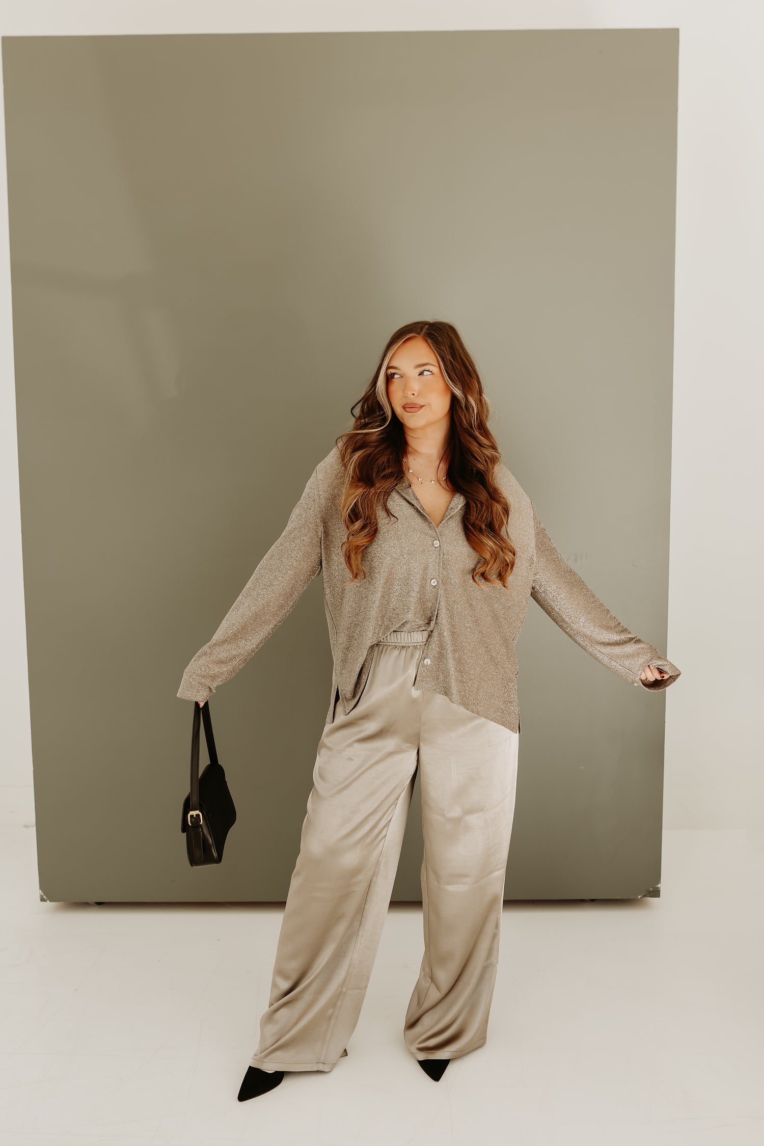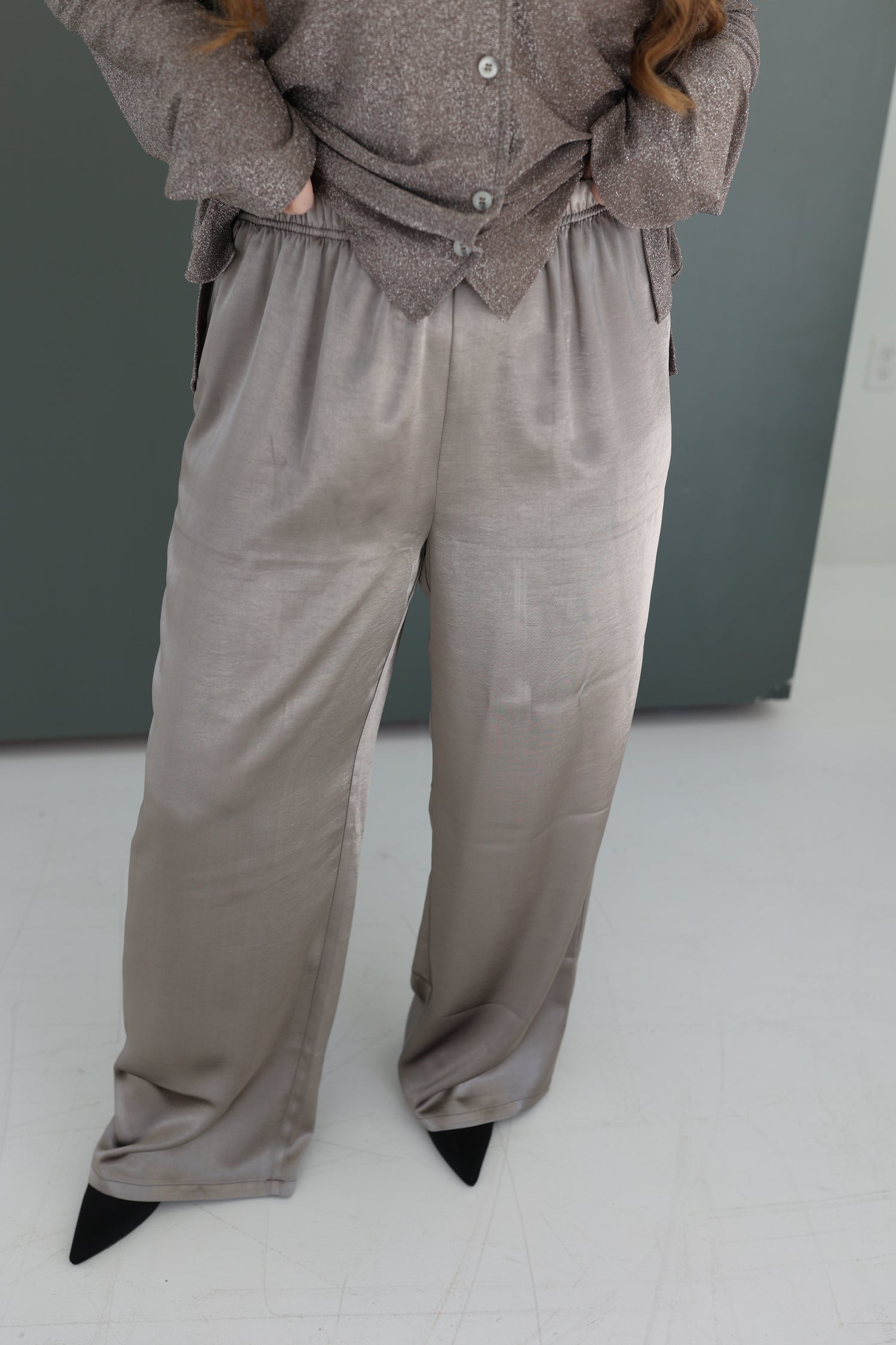 These silky style pants are your NEWEST obsession! These pants have a very wide leg relaxed fit with an elastic waistband and pockets. Very beautiful, silky, shiny material! Perfect to dress up or wear more casual! We are loving this trend!